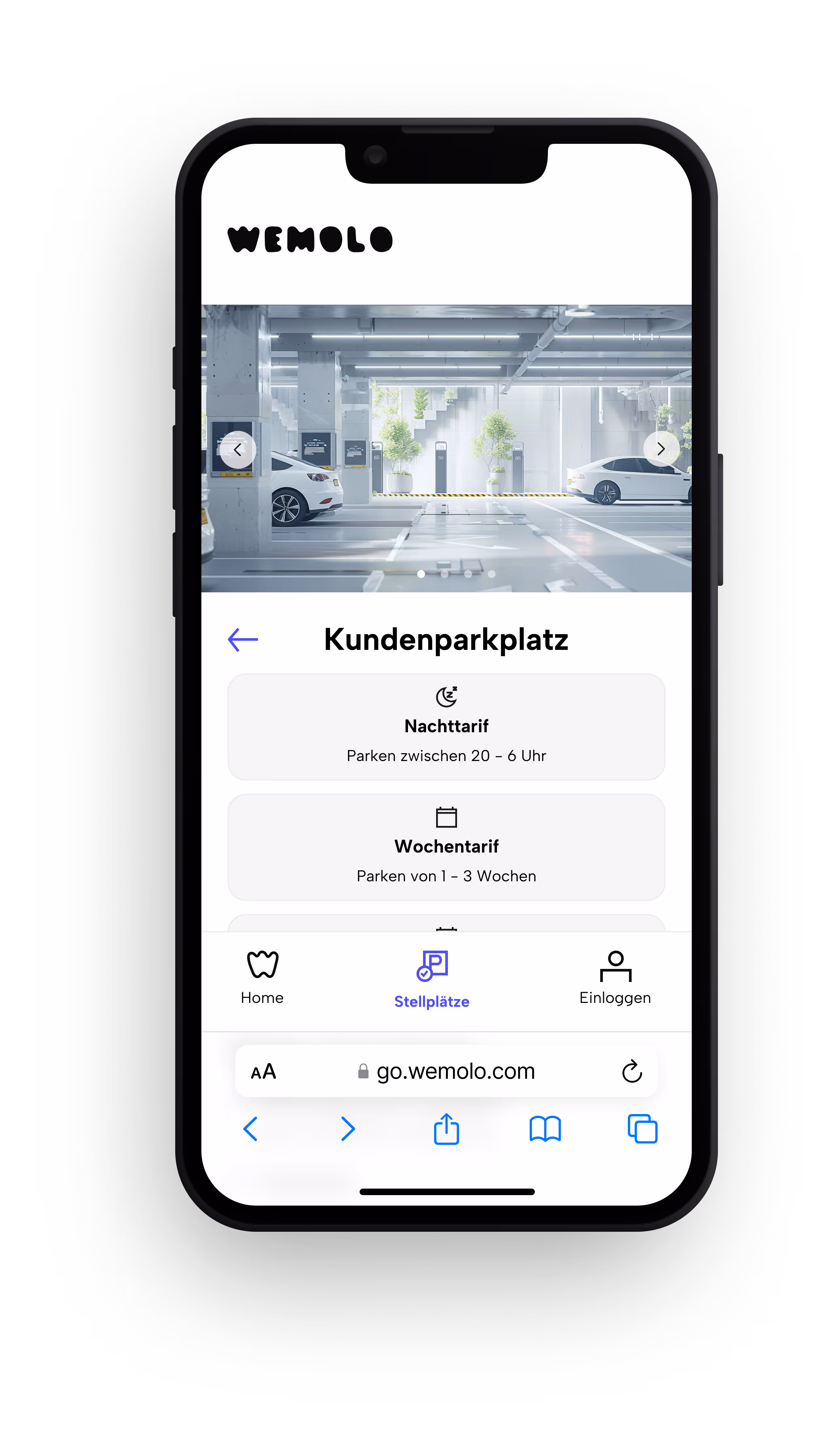 Nutzende buchen einen Stellplatz bequem über go.wemolo.com. Die Parkzeit wird automatisiert durch Kennzeichenerkennung bei Ein- und Ausfahrt erfasst, ganz ohne Tickets und Schranken.